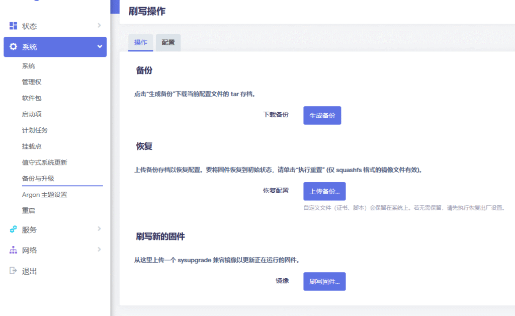 在下面的子菜单中,点击“备份与升级”进入刷写操作页面: